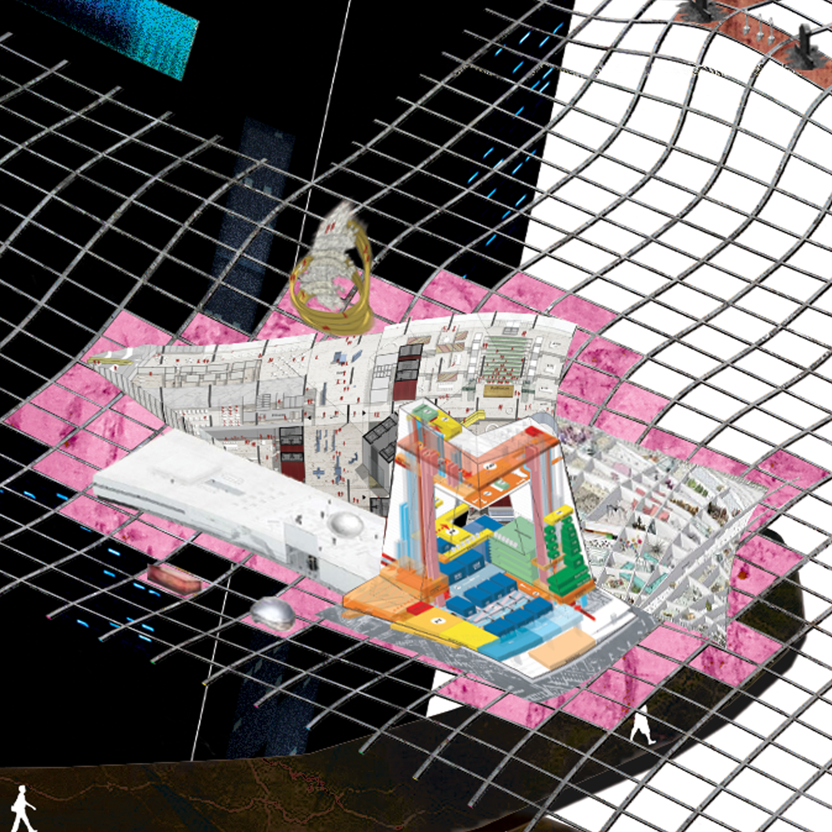 The collage is a descriptive tool. Through the montage of clippings, a story unfolds about the subject matter being created, but also what it represents. OMA’s DNA is woven into the montage through meticulous placement and reference to several canon projects in the firms stories past. Agadir, NAI, Zebruge, ZKM, Den Hague, Exodus, Salvador Dali, Berlin, Constructivism all have a place in the image. Image coordinated and presented with Elia Zenghelis.